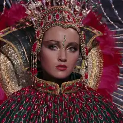 The emphasis on Solitaire's chastity is conveyed, to begin with, by the high neckline of her first appearance in ethnic dress, and the colour red, which, with its associations with blood, and, in turn, menstruation and childbirth, is simultaneously used to foreshadow a bride's loss of virginity and future fertility in ethnic bridal gowns. Later, in St Monique, the bridal motif is pursued through a more revealing red dress, elaborate headdress, and a green cape studded with red stones; since Solitaire is about to lose her virginity to Bond, her neckline has dropped. Back in New York, the neckline plunges down to a butterfly appliqué stitched on the high waist of the red and gold dress she wears on her last tarot reading session.[5]