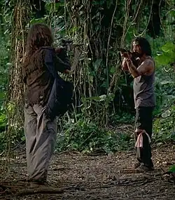 ![]() Sayid and Danielle Rousseau have a stand-off in the jungle after Sayid leaves Rousseau’s confinement | |