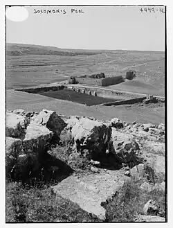 The pools are named and traditionally associated with King Solomon[2] and linked to the passage in the Book of Ecclesiastes 2.6: "I made myself pools from which to water the forest of growing trees." Josephus wrote that Solomon enjoyed the beauty of the water-rich "Etham" (one of the main springs is called Ein Eitam = Hebrew: עין עיטם).[10][11] The pools are in close proximity to the ancient town of ʻEiṭam (now Khirbet al-Khuaḥ) and the spring known as ʻAin ʻEiṭam. Legend has it that the king built the pools for his many wives, so that they could bathe in their waters.[12]