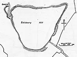 It is sometimes misspelled as Salisbury, or Solisbury, perhaps because of confusion with Salisbury Plain (a plateau in southern England), or the city of Salisbury. Salisbury and Solsbury can be difficult to distinguish in speech; Salisbury is often pronounced "Saulsbury", and sometimes the "a" in "Salisbury" is pronounced as an "o", and the "i" is elided, making the pronunciations of the two words practically identical.[2] The name 'Solsbury' may be derived from the Celtic god Sulis, a deity worshipped at the thermal spring in nearby Bath.[3][4] A geological map by Horace B Woodward in the back of the 1888 Handbook of Bath labels the hill as 'Stilisbury Hill'.
