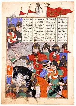 ![]() "Kay Khosrow Marches to Godarz's Rescue". Miniature from the "Big Head Shahnama", produced for Soltan-Ali Mirza in 1493/94 | |