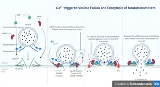 - ^ a b Rizo J (August 2018). "Mechanism of neurotransmitter release coming into focus". Protein Science. 27 (8): 1364–1391. doi:10.1002/pro.3445. PMC 6153415. PMID 29893445.