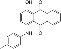 Solvent Violet 13, also known as D&C Violet No.2, oil violet, Solvent Blue 90, Alizarine Violet 3B, Alizurol Purple, Duranol Brilliant Violet TG, Ahcoquinone Blue IR base, Quinizarin Blue, Disperse Blue 72, and C.I. 60725, is a synthetic anthraquinone dye with bright bluish violet hue. It is a solid insoluble in water and soluble in acetone, toluene, and benzene. Its chemical formula is C21H15NO3, and its structure is 1-hydroxy-4-(p-tolylamino)anthraquinone, or 1-hydroxy-4-[(4-methylphenyl)amino]-9,10-anthracenedione or 1-hydroxy-4-(4-methylanilino)anthraquinone.