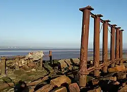 The viaduct was effectively a trestle construction with 193 spans of 30 feet (9.14 m); each pier consisted of five cast iron columns of hollow section, 12 inches (305 mm) diameter; the outer columns were raked, acting as buttresses to the three inner load-bearing columns. The columns were founded on iron tubular piles that were driven by a steam pile driver, after an unsuccessful attempt to screw them in to the substrate. Originally, the viaduct was to be of 80 30-foot spans, the railway being carried on a solid embankment as far as the low-water mark on either side. A 36-foot opening span was to be provided to allow the passage of small craft to the upper Solway ( chiefly to Port Carlisle);[16] the Board of Trade however objected to so major an obstruction to tidal flows and required a 50-foot opening span to allow the passage of steam tugs. The promoters accepted both objections at first,[17] but the Solway Junction Railway Act 1867 made no provision for an opening span, the promoters arguing that the traffic of Port Carlisle was negligible and should not be allowed to compromise the viaduct design. This argument won the day; although the Board of Trade confirmed its earlier stand that the traffic of Port Carlisle was not negligible,[18] Parliament was persuaded that it was insignificant in comparison to the projected traffic over the viaduct and as built the viaduct made no provision for ships to pass through it; this ended any commercial use of the harbour at Port Carlisle.