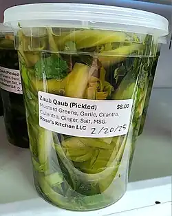 ![]() A container of zaub quab (Hmong pickled mustard leaf) at an American supermarket | |