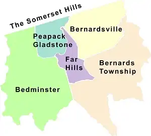 The Somerset Hills is known as the northern region of Somerset County located in the central portion of the U.S. state of New Jersey and includes the municipalities of Bedminster, Bernardsville, Bernards Township, Far Hills, and Peapack-Gladstone.[1] The neighboring municipalities of the Chesters (Borough and Township) and the Mendhams (Borough and Township) in southwestern Morris County are periodically recognized as part of the Somerset Hills.[2][3][4]