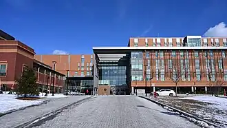 Somerville High School underwent extensive rebuilding in the late 2010s and early 2020s. Planning began in 2012, and voters passed a Proposition 2+1⁄2 override in 2016. Construction began in April 2018, displacing students. The original 1895 building was retained, as was the facade of the 1929 War Memorial. A new connected building opened to a small number of high-need students in various grades on March 4, 2021, during the COVID-19 pandemic in Massachusetts. Construction on the auditorium and cosmetology lab was still in progress, and new athletic fields are expected to be complete by spring 2022.[5] A new broadcast studio is shared with the city government, and the 750-person auditorium and a 100-person lecture hall will be available for community events.[5] The new complex is 396,000 square feet (36,800 m2) with capacity for 1,590 students.[5]