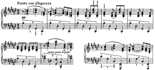 47–95 | The exposition commences at m. 47. The first theme, marked presto con allegrezza is in F♯ major and set in binary form. The first half begins with a 6-bar phrase (harmonized as dominant eleventh chord) followed by the same phrase transposed a fourth higher (harmonized with a C♯ minor seventh chord). After this, a 4-bar and a derived 5-bar phrases. The second half (mm. 69 ff.) begins as A but now over a tonic pedal. After reprising the first 12 bars, a series of shorter phrases bring more agitation to the passage, leading to the transition passage. |