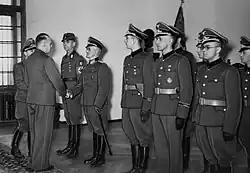 ![]() Leaders of General Government during inspection of Sonderdienst battalions: from right, Generalgouverneur Hans Frank, Higher SS and Police Leader GG Herbert Becker and secretary of state Ernst Boepple | |