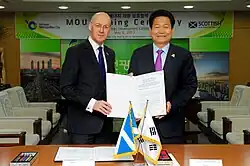 He became the Chairman of the Korean-Japan Inter-Parliamentary Council's 21st Century Committee in 2004, and consequently held discussions and conferences on the various issues concerning Korea and Japan. He was also the Chairman of the Korea-France Parliaments' Friendship Association and led active exchanges to promote knowledge about the EU and France. In 2007, he received Légion d'Honneur Chevalier from France for his dedication in promoting relations between Korea and France.[6] After his second term, Song realized the importance of diplomacy and visited and received other nations in order to increase exchanges and deepen the understanding of the US, Australia, China and other neighboring nations. When the Korea-US FTA negotiations began in 2006, Song became the Chairman of the Uri Party's Special Committee on the Korea-US FTA in order to reflect the opinions of stakeholders and to take measures.[7] As such, he was able to expand exchanges with US officials including negotiation delegates and US congressmen. As the recognition of products from Gaesong Industrial Complex as Korean products became a hot issue, Song exchanged opinions on Gaeseong Industrial Complex that could help North Korea's self-reliance and guarantee peace on the Korean Peninsula. In 2007, at the invitation of a US senator, he attended a reception marking the opening of the US Congress and discussed the Korea-US FTA, the North Korean nuclear program, and peace on the Korean Peninsula with then presidential nominee Obama, Senator Biden and other congressmen of the Democratic Party. In 2008, the results of the US presidential election and the Democratic Party's regaining control after 8 years demanded new cooperation and close exchanges between Korea and the US. Song formed a Special Committee on Korea-US Relations Development and as chairman he endeavored to establish balanced diplomatic relations between Korea and the US, develop inter-Korean relations, enhance the Korea-US alliance, and promote economic cooperation including the Korea-US FTA.