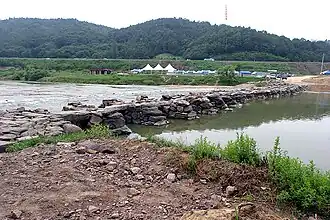 Next, the priest tells her to tear out all her hair and entwine them into a string three thousand feet long, and to tie one end of it to a pine tree on top of Mount Nam and the other end to a pillar in Geumsang Temple. She must then thread the hair-string into holes in her palms and go back and forth on the string three thousand times. When the string snaps, she sees Dorang-seonbi washing his face. She runs there and finds nothing but water. Finally, the priest tells her to pave the harsh roads to Geumsang Temple with her bare hands.[4] At last, she is reunited with her husband, but he falls off a bridge and drowns on the way.[4] When Cheongjeong-gaksi digs a pit near Dorang-seonbi's grave and weeps inside it, her husband returns.[30]