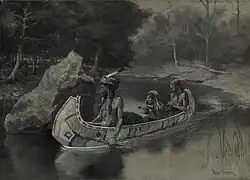 Toward the end of the 19th century, artists deliberately emphasized the epic qualities of the poem, as in William de Leftwich Dodge's Death of Minnehaha (1885). Frederic Remington demonstrated a similar quality in his series of 22 grisailles painted in oil for the 1890 deluxe photogravure edition of The Song of Hiawatha.[70] One of the editions is owned by the Metropolitan Museum of Art.[71] Dora Wheeler's Minnehaha listening to the waterfall (1884) design for a needle-woven tapestry, made by the Associated Artists for the Cornelius Vanderbilt house, was also epic.[72] The monumental quality survives into the 20th century in Frances Foy's Hiawatha returning with Minnehaha (1937), a mural sponsored during the Depression for the Gibson City Post Office, Illinois.[73]