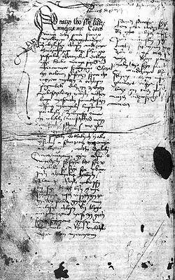 Written in the late 15th century on the last free page (97 verso) of the so-called Zamoyski Codex – containing the oldest known copy of Gallus Anonymus' Gesta principum Polonorum from the 14th century[18][19] – the parchment manuscript belonged to Jan Długosz,[20] then the Zamoyski family entail, and now resides in the National Library of Poland in Warsaw (signature rps BOZ 28).[19][20] First published by Kazimierz Władysław Wóycicki in 1848 in his Album Literacki (vol. I, chapter Pieśń polska z r. 1462 o zabiciu Andrzeja Tęczyńskiego),[18] it received critical analysis in 1886 by Władysław Nehring in Ein Lied (?) auf die Ermordung des Fahnenträgres Andreas Tenczyński am 16. Juli 1461 in Krakau (in Altpolnische Sprachdenkmäler, Berlin).[5]