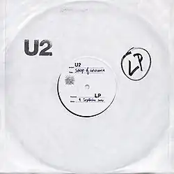 The album art for iTunes copies of the album was created by MAD Agency London to resemble white label packaging commonly used for promotional LP record pressings. The artwork, an "anti-cover design", is a homage to the vinyl promo release format that was popular during the late 1970s and early 1980s, a period referenced by U2 on the album.[71]