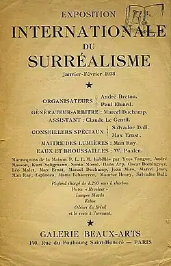 In 1938, Sonia Mossé took part in the International Surrealist Exhibition in Paris. It took place from 17 January to 24 February at the Galerie Beaux-Arts of Georges Wildenstein, rue du Faubourg-Saint-Honoré. Sonia Mossé created a female mannequin whose head was covered with a black mourning veil that fell to her feet. On the mannequin's lips rests a dark-coloured false beetle and in her navel sits a small scorpion. The naked body is covered by a few water lilies and other beetles, and between her legs rises the calyx of a flower resembling a calla lily – 'the only model-artist has thus also created the only resolutely phallic interpretation of the sex of the doll in the strict sense.'[9] In the exhibition space entitled Les plus belles rues de Paris, her mannequin is exhibited together with others, including those of Joan Miró, André Masson, Yves Tanguy, Hans Arp, Wolfgang Paalen, Marcel Duchamp and Salvador Dalí. There are photographs of this great exhibition taken by Denise Bellon,[10] Raoul Ubac,[11] Pierre Jahan,[12] Gaston Paris,[13] and Georg Reisner,[14] as well as by Man Ray. Man Ray's pictures were published in 1966 in a limited edition under the title Résurrection des mannequins.[15]