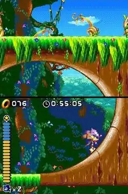 New features include a grading system that grades the player based on the time it takes for them to complete the level; they can return to levels later to try for a higher grade.[7] There is a point system based on the one in Sonic Advance 2 but displaying points in multiple categories. Sonic Rush introduces a "Tension Gauge" on the left side of the screen which is filled by doing tricks and defeating enemies.[3] The energy it generates allows the player to use boosts of speed while moving;[4] defeating enemies,[3][5] moving through the level more quickly, which results in more points and a higher grade, and when playing as Sonic, accessing the special stage.[4] Although the game is primarily two-dimensional, there are three-dimensional elements which create a 2.5D effect.[3]