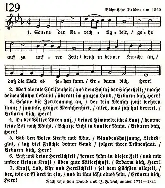 "Sonne der Gerechtigkeit" (Sun of Justice) is a German Christian hymn with a complex history. The image of a sun of justice or righteousness was created by the prophet Malachi. The text was compiled around 1930 by Otto Riethmüller from older stanzas by different hymnwriters, intended as a wake-up call to the church in a Germany facing the rise of the Nazis. Four of its originally seven stanzas were written in the 18th century, two by Johann Christian Nehring, and two by Christian David. The remaining stanzas were taken from Christian Gottlob Barth, written in the 19th century. An alternative seventh stanza was suggested in 1970, with a strong ecumenical focus. The hymn expresses a call for justice, renewal and unity, within the congregation and church, and among peoples.