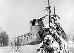 The original 1925 building was small and had a 5 m dome. Several wooden barracks with movable roofs from that time no longer exist. The first building was later extended and then included a lecture hall.[2] In 1938 a new instrument, an astrograph was installed. This was removed to the Soviet Union after the Second World War, but replaced in 1960/1961 with two astrographs, funded, resp., by Zeiss Jena and Hoffmeister.[4]