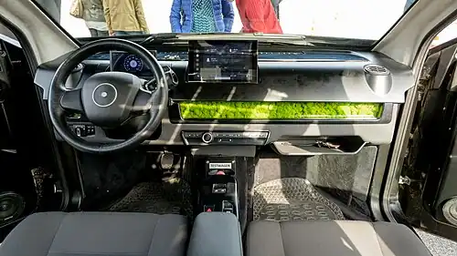 The Sion has room for 5 passengers. The seats offer 45 centimetres (18 in) of shoulder freedom and are all foldable. The drivers' seat is adjustable in height and position. The outer color will be black. The luggage compartment has a standard capacity of 650 litres (23 cu ft) and can be increased to a total of 1,250 litres (44 cu ft) by turning over the rear seats. In the interior, a natural filter made of moss regulates the humidity and filters fine dust (breSono). Front and rear airbags can be deactivated, so that child seats can be used. The electric handbrake is integrated into the center console. A trailer coupling for trailers up to 750 kilograms (1,650 lb) will be available as an option.