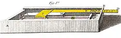- [In Figure 1] AB is a box that contains a sliding piece, DEF, that runs along the other piece, LM, that is attached to the bottom of the box. The end at ED comes out through an opening similar to the one cut in B. The other end [of the sliding piece], F, has a sort of right-angle bar [équerre] that is attached to it with a screw and that is pushed by a spring so that this right angle will pluck the string HNG at the place marked I.