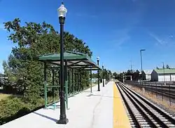 Many of the station platforms are located near historic depots in city centers. However, SMART does not directly use these,[77] and all stops use newly constructed 48-inch (120 cm) high-floor platforms to allow level boarding onto and off of the train and provide accessibility.[78] A gauntlet track is used at all stations north of the freight interchange at Ignacio to allow freight trains to pass while bringing passenger trains up to the platform edge.[79][80] Stations typically include a small shelter with a peaked roof and a bench for seating; they also feature light poles, signs, and garbage cans.[81] Original plans called for ten stations in the initial operating segment (IOS) with five more in a second phase. A further station was added in Novato's downtown district late in construction of the IOS,[82] and did not open with the system's inauguration.