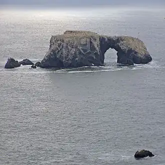 Sonoma Coast State Park is a State of California property in Sonoma County consisting of public access use on lands adjoining the Pacific Ocean. This extent of beach runs from a coastal point about 4 miles (6 km) north of Jenner and continues for approximately 17 miles (27 km) to the south to terminate at Bodega Head. The property lies along State Route 1 and consists of a number of named beaches including Arched Rock Beach, Gleason Beach and Goat Rock Beach. The ecosystem consists of alternating sandy beaches and rocky shoreline, with a marine terrace extending above the entire extent with an upland California coastal prairie habitat.