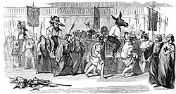 "The order [of the Sons of Malta] was understood to claim an origin with the persecuted saints of the Isle of Malta in the fifteenth century, but this was doubtless nearer fiction than reality. Its precise character and object were never definitely disclosed. The public gained an impression that it was largely for the cultivation of whatever was comic, droll or ridiculous in thought, speech and action. It had sufficient membership to give a long spectral procession one night, the marchers draped in sheets, which nearly the whole town came curiously out to see."[37] Many lodges of the Sons of Malta organized spectacular, solemn marches, often at midnight and usually followed by all night repasts by the members. Most accounts of the marches noted public enjoyment of the spectacle, but in commenting on reports of one such march in New York City, The Emporia Weekly News wrote "What the Sons of Malta are, or what all this fantastic mummery signifies, we do not know. It seems very much like a regretful look backward from civilized life towards the freedom and unreason of barbarism."[38]