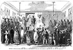 A National Encampment (also called a "Grand Encampment" in some newspaper reports) was held in Washington, D.C. on Feb. 15, 1860, "the object being a thorough revision of the laws and ritual of the order."[45] Representatives from the National Encampment were received by President Buchanan:[46] "So solemn was the scene that several portly delegates were evidently convulsed with emotion (or secret laughter), and the Union was regarded as safe. Owners of ships, stocks, States, and the Order took courage," as Benjamin Poore later wrote in his recollections.[47]
