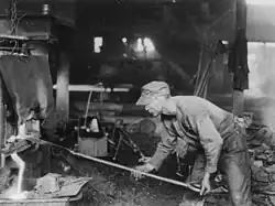 Puddling is the process of stirring pig iron with iron bars, exposing it to the air so that the carbon in the pig iron is oxidized and burns off. This process creates steel.[5] As practiced in the early and mid-19th century, puddling required great strength as well as skill.[1] Because chemical testing of the molten iron had not yet been developed, puddlers relied on their long experience with steelmaking to determine whether too much or too little carbon had been oxidized.[1][5] Puddling was also an extremely dangerous trade, as some steel processes required the molten metal to boil and bubble as the puddler stirred in scrap iron and puddlers were required to physically remove slag and drain pure steel out of furnaces for additional processing.[1][5]