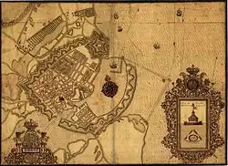 The queens acquisitions occupied an area roughly defined by present-day Bredgade, Frederiksgade, Amaliegade and Sankt Annæ Plads.[1] Work on the garden began in 1664 and from 1666 to 1667 the Frenchman Michel le Roy was responsible for its design, particularly that of the fountains and the water system.[1] The pleasure palace was built from 1669 to 1673 after Sophie Amalie had succeeded in providing the necessary means in spite of the hard times following the war. It is unclear who was the architect of the building but it is generally attributed to Albertus Mathiesen.[2] Another possibility is that le Roy was also involved in the design of the palace and not only the gardens. In early documents he is referred to merely as "Ingenieur", while he is later titulated "Baumeister der Koniginn".[1]