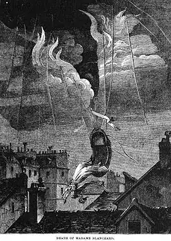 Blanchard had performed regularly at the Tivoli Gardens, making ascents twice a week when she was in Paris.[3] She had been warned repeatedly of the danger of using fireworks in her exhibitions. This display was to be a particularly impressive one with many more pyrotechnics than usual, and it appears that the warnings had made an impression on her. Some spectators implored her not to make the ascent, but others, eager to see the show, urged her on. One report suggested that she finally made up her mind and stepped into her chair with the words "Allons, ce sera pour la dernière fois" ("Let's go, this will be for the last time").[24]