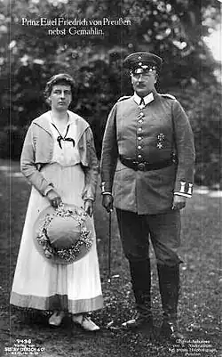 In June 1905, Sophia Charlotte first met Prince Eitel Friedrich of Prussia at the wedding of his brother Crown Prince Wilhelm to Duchess Cecilie of Mecklenburg-Schwerin.[6] They were both sons of Wilhelm II, German Emperor and Augusta Viktoria of Schleswig-Holstein. In Kiel later that month, Sophia Charlotte became better acquainted with him.[1] Eitel's mother in particular desired the match, as she wanted her son to marry one of the Oldenburgs (a family considered quiet, inoffensive, and suitable for a prince).[7] The Oldenburgs were also an ancient family with strong ties to both the Empress and Emperor (as Sophia Charlotte's mother had been a Prussian princess). Her family also had other strong ties to the Hohenzollerns, as Sophia Charlotte's mother had been a great intimate of the Duchess of Saxe-Meiningen, the Emperor's sister.[3] The Duchess was also Sophia Charlotte's godmother, and Sophia Charlotte was herself a favourite of the Emperor.[3] Her closeness to the Prussian court was so pronounced in fact that it had even sparked some early rumours that she would marry Prince Wilhelm instead.[3] Wilhelm had been allowed to choose however, and had settled on Duchess Cecilie.