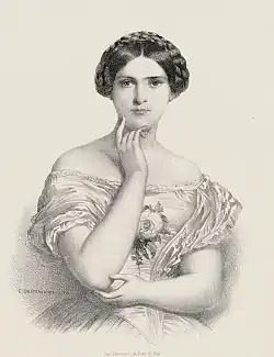 Cruvelli had a short spell in Bellini's Norma at the Royal Opera House in Berlin, and then sang from November 1848 until March 1849 at the Teatro Grande in Trieste, mainly in Verdi's Attila, Ernani and Macbeth, and in Don Pasquale.[6] At the end of 1849 she sang Odabella in Verdi's Attila as the leading lady at the opening night of La Scala in Milan, and through the ensuing season (1850) made no fewer than sixty appearances there in Attila, Nabucco, Ernani, Il barbiere di Siviglia, Norma and Vincenzo Capecelatro's David Riccio.[17] In the same year she appeared at the Teatro Carlo Felice in Genoa in Verdi's new opera Luisa Miller, and repeated her Ernani, Nabucco, Attila, and Norma.[18] In Milan and Genoa she made a great sensation.[6]