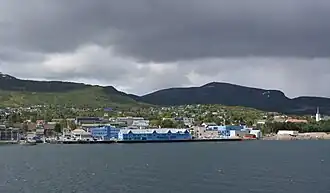 Sortland (Norwegian)ⓘ or Suortá (Northern Sami)[4] is a town[1] and the administrative centre of Sortland Municipality in Nordland county, Norway. The town is located on the east coast of the island of Langøya, along the Sortlandsundet strait. In 1997, the municipality decided to declare "town status" for the urban area of Sortland. Sortland is the largest town and commercial centre in the whole Vesterålen region and is often referred to as "the blue town by the strait" (den blå byen ved sundet) since many of the buildings are painted blue.[5]