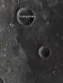 By convention these features are identified on lunar maps by placing the letter on the side of the crater midpoint that is closest to Sosigenes.