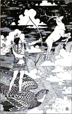 The Iroquois mythic hero Sosondowah was a great hunter known for stalking a supernatural elk, Oh-je-a-neh-doh.[1] Sosondowah was captured by Dawn, a goddess who needed him as a watchman. He fell in love with Gendenwitha ("she who brings the day", also spelled Gendewitha), a human woman. He tried to woo her by singing to her in spring as a bluebird, in summer as a blackbird and in autumn as a hawk, who then tried to take Gendenwitha with him to the sky. Dawn tied him to her doorpost and then changed Gendenwitha into the Morning Star, so he could watch her all night but never be with her.