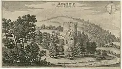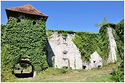 Soteska Mansion (German: Schloß Ainöd)[6] is now a ruin. It stood on the banks of the Krka River and was built by Count Georg Sigmund von Gallenberg in 1664 and 1689. It had a rectangular layout with an interior courtyard bordered by four two-story arcades, and four rectangular towers at the corners. The entry tower bore the crest of the Gallenberg and Schrottenbach families and the year 1675. The interior was richly painted, with some works attributed to the 17th-century Dutch painter Almanach.[7] Soteska Castle was characterized by Johann Weikhard von Valvasor as one of the most beautiful castles in Carniola.[6][7] The castle was sold to the Auerspergs in 1733, and then to the Counts of Lichtenberg in 1743. The Auerspergs reacquired the castle in 1793 and owned it until the Second World War. The Partisans looted and burned the castle on 23 October 1943,[4][6][8][9] and after the war many of the building stones were carried off.[7] The gardens in the castle grounds survive,[10] with a pavilion now referred to as the Devil's Tower (Slovene: Hudičev turn).[4][6] The tower contains paintings by the 17th-century Dutch painter Almanach.[4]