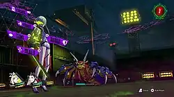 Enemies in dungeons are represented by humanoid symbols, their colour determining enemy strength and aggression. Ringo can stun them and avoid combat, or engage; if the enemy hits the party first, they get the first attack in combat, while Ringo initiating the attack gives the party first attack and can trigger a free opening attack from a party member.[1][7] Battles are turn-based, with each side getting a set of actions, using both standard attacks and skills assigned to their COMP weapons via Demons.[2] A core element of combat is exploiting weaknesses, which deal more damage; weakness include elemental attacks, and melee or ranged attacks depending on enemy type. Striking an enemy's weakness adds points to a Stack, and at the end of that turn the accumulated Stack is spent in a Sabbath, a powerful multi-Demon attack that increases in strength with higher Stack points. Some demons can learn and use Tamdem Skills, adding an additional effect to the Sabbath such as inflicting a status effect or recovering the party's magic points.[2][7] Another later element of combat is Commander Skills, an ability unique to Ringo that grants special boons in battle.[5][7]