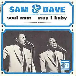 "Soul Man" is a 1967 song written and composed by Isaac Hayes and David Porter, first successful as a number 2 hit single by Atlantic Records soul duo Sam & Dave,[3] which consisted of Samuel "Sam" Moore and David "Dave" Prater. In 2019, "Soul Man" was selected for preservation in the National Recording Registry as "culturally, historically, and aesthetically significant" by the Library of Congress. It was No. 463 in "Top 500 Greatest Songs of All Time" by Rolling Stone in 2010 and No. 458 in 2004.[4][5]