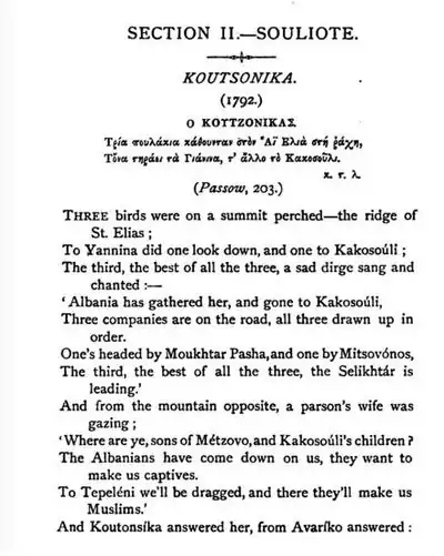 - ^ Zambelios Spyridon, Asmata Demotica tes Hellados (Greek Folk Songs), 1852. In Greek language. Some of the Souliotic songs are in pp. 644 (Death of M. Botsaris), 646 (Death of Kitsos Botsaris), 689 (The Treason of Delvino), 691 (Ali Pasha), 692 (Fall of Souli) etc.