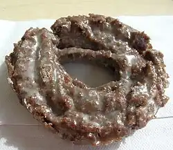 A sour cream doughnut is a type of doughnut that incorporates sour cream into its batter.[1] This type of doughnut is often dipped in a vanilla flavored glaze after frying and usually has no filling.[1] While the exact date or place of origin for the sour cream doughnut is not known, one recipe for this type of doughnut was published by the Ladies' Aid Society of Marion, Ohio in 1894.[2]