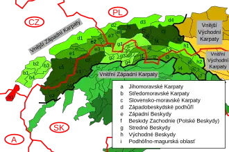![]() South-Moravian Carpathians (marked in red) within the Outer Western Carpathians | |