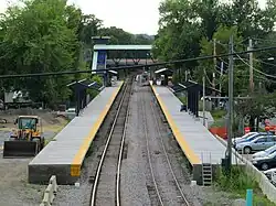 On June 11, 2012, the MBTA opened bids for the $9.622 million construction project.[13] Construction preparation began in September 2012. During the periods where the 1980s-built station platform was closed, temporary platforms east of the station (at the former station site) and west of the station were used to board passengers.[3] These platforms were installed in October and November 2012; ceremonial groundbreaking was held in December.[14][15]