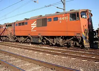 During 1990 and 1991, Spoornet semi-permanently coupled several pairs of otherwise unmodified Series 2 to Series 9 Class 6E1 electric locomotives, reclassified them to Class 16E and allocated a single shared unit number to each pair, with the individual locomotives in the pairs inscribed "A" or "B".[1]