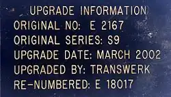 On some early rebuilds a small plate, about the size of a cigarette packet and engraved with the upgrade information was attached on the cab wall in Cab 1 next to the compressor ventilation opening. The specimen depicted is in error about the original Class 6E series, which was S11 in the case of no. E2167.