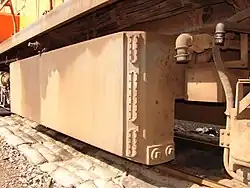 To be usable on the iron ore line, Class 34-000 locomotives which ended up working there were modified to a similar fuel capacity. The inter-bogie linkage was removed and the fuel tank was enlarged by changing it from saddle-shaped to rectangular box-shaped. To maintain its lateral balance, a slab of metal was attached to each bogie in place of the removed linkage. In the second picture, the weld lines on the end of the enlarged fuel tank as well as the metal slab at the end of the bogie are visible.[8]