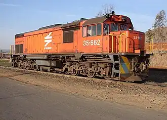 The Class 35 family is South Africa's standard branch line diesel-electric locomotive. The GM-EMD Class 35-600s were designed for light rail conditions and they work on most branch lines in the central, eastern, northern and northeastern parts of the country.[3] A number of them also saw service in Richards Bay working the Golela line.