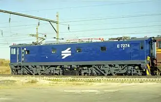 While it is doubtful that the intention was to have a Class 7E4 in blue train livery for blue train hauling on the Richards Bay line, the ones photographed, numbers E7272, E7274 and E7275, were nevertheless painted in Spoornet's maroon era Blue Train livery after being rebuilt, possibly to make them easier to identify at a glance.[7]