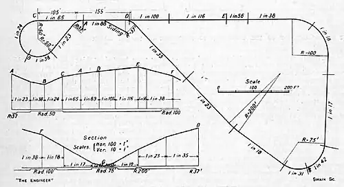 In 1917, General Manager Hoy authorised a trial of the system and a test circuit was laid on the veld at Canada Junction, 9 miles (14 kilometres) from Johannesburg. The dog-bone test circuit was 742 yards (678 metres) around, laid with light 16 pounds per yard (8 kilograms per metre) rails on 7 pounds (3 kilograms) steel sleepers and hook bolts. The track included tight curves of as low as 37 feet (11 metres) in radius and steep gradients of as much as 1 in 17 (5.88%).[1]