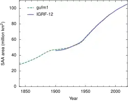 The area of the SAA is confined by the intensity of Earth's magnetic field at less than 32,000 nanotesla at sea level,[1] which corresponds to the dipolar magnetic field at ionospheric altitudes.[2] However, the field itself varies in intensity as a gradient.[1]: Figure 1